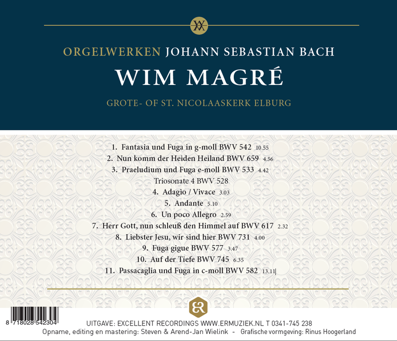 Eén van de discussiepunten bij het spelen van muziek uit de Barok, dus ook de muziek van Bach, is het al dan niet portato of legato spelen. Mijn voorkeur gaat uit naar portato, vooral ook om de helderheid en de structuur van Bachs muziek tot zijn recht te laten komen. Wim Magré maakt van beide gebruik. Dat zorgt ervoor dat de muziek ten allen tijde boeiend blijft klinken. Verwacht op deze cd geen ‘romantische’ Bach, maar ook geen Bach die recht doet aan barok-purisme. Gelukkig niet. Het is de verdienste, en wat mij betreft de meerwaarde, van deze Bach-cd dat Magré theorie en muziek op een boeiende wijze weet te combineren tot ‘spel’. In samenspel met de registraties, de tempi en daardoor de prachtige, echt Elburgse, klankkleur is deze cd meer dan alleen een Bach-cd of een cd van het orgel in Elburg. Kortom: hier wordt muziek gemaakt. Vooral de fuga’s op deze cd varen er wel bij. Uiteraard moet hierbij ook een compliment gegeven worden Excellent Recordings die ervoor heeft gezorgd om al dit moois goed op de schijf te krijgen. Ik heb nog geen mooiere opname van het orgel in Elburg gehoord.