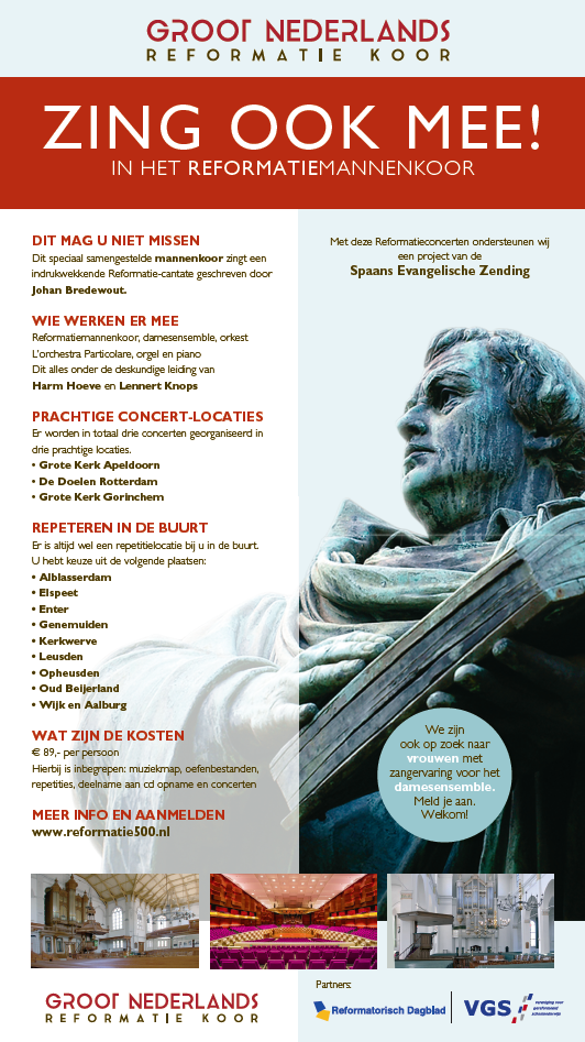 De projectgroep Reformatie500 treedt zaterdag 25 maart naar buiten met zijn plannen om de herdenking van vijf eeuwen Kerkhervorming muzikaal vorm te geven. Hoofdactiviteit is het werven van een Groot Nederlands Reformatie Mannenkoor, dat in de periode oktober tot en met december drie concerten verzorgt. Dirigent is Harm Hoeve.